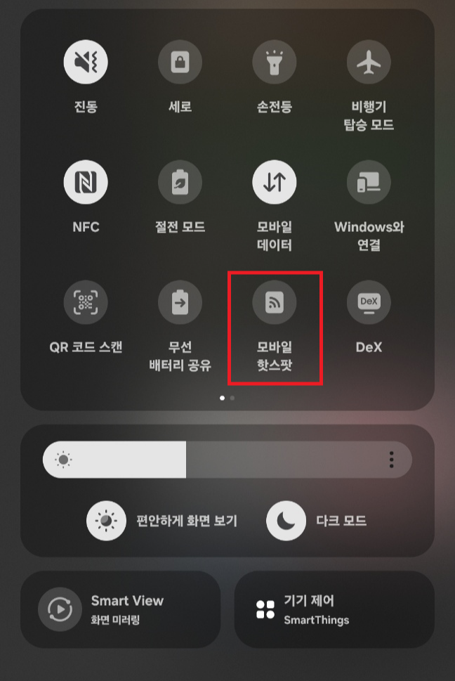 상단 바를 내려서 모바일 핫스팟 활성