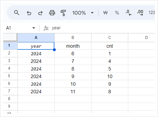 데이터소스에 등록할 구글시트 데이터를 생성 합니다.