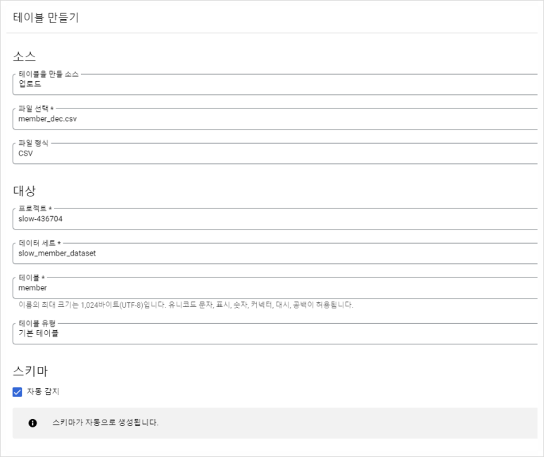 테이블 만들 소스는 업로드 선택, 스키마 자동감지 등 아래정보 참고하여 입력하시고 "테이블 만들기" 클릭