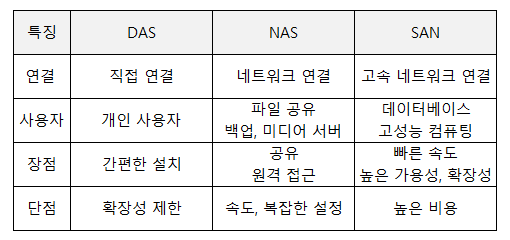결론적으로, NAS, DAS, SAN은 각각의 특징과 장단점을 가지고 있으며, 사용 목적과 환경에 따라 적합한 스토리지를 선택하면 됩니다.