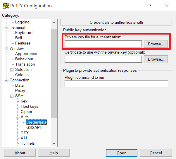 아래 그림 처럼 "browse" 버튼을 클릭하여 PuTTY key generator에서 생성한 private key(.ppk) 를 가져옵니다.
