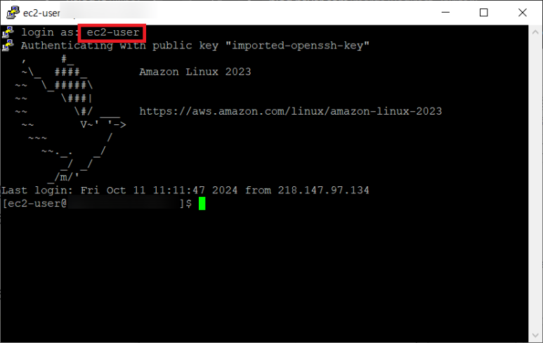 저는 Linux환경에 접속하므로 "ec2-user"로 로그인. 만약 AWS EC2 Ubuntu 환경이라면 "ubuntu"로 로그인 하면 됩니다.