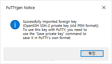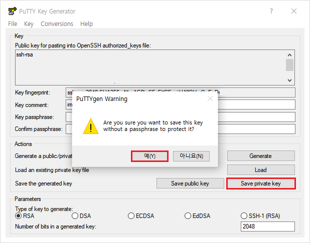 Save private key를 클릭한 후 경고창이 뜨면 예를 클릭하여 .ppk 확장자로 개인키 파일을 저장합니다.