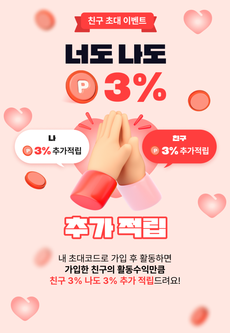 중요한점은 현재 이벤트 기간중입니다. 추천코드를 입력하면, 추천받은사람과 추천한사람 모두 3%추가 수익을 얻을 수 있습니다.