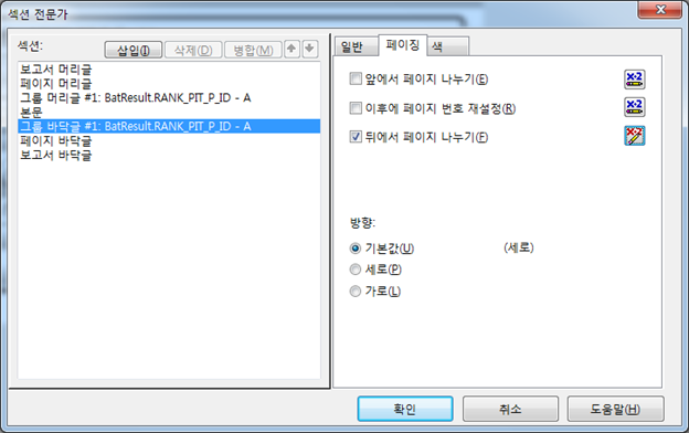 위와 같은 구성으로 리포트를 작성해서 섹션전문가에서 [그룹바닥글]에 " 뒤에서 페이지 나누기 " 옵션을 준다.