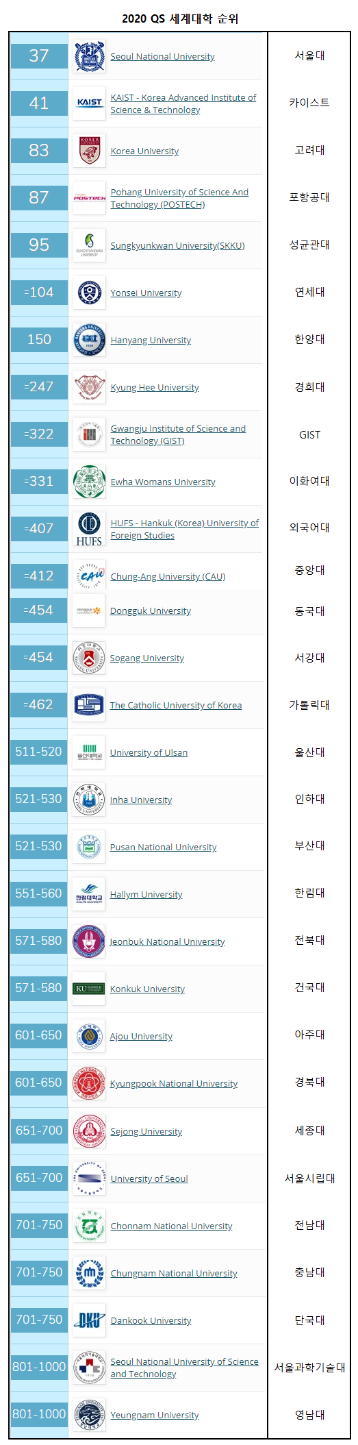 2020 QS 국내 대학 순위