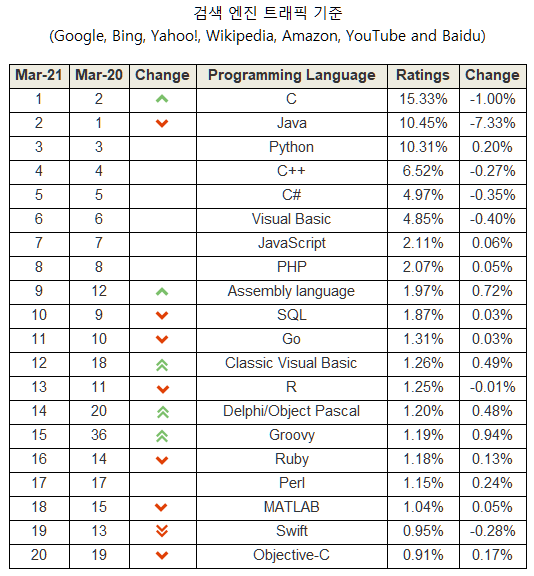 프로그래밍 언어 순위 (2021년 11월 기준) 검색엔진 트랙픽 측정대상 Google, Bing, Yahoo, Wikipedia, Amazon, YouTube, Baidu 참고 tiobe.com 프로그래밍 언어 순위 자료 2021년 03월 기준 프로그래밍 언어..