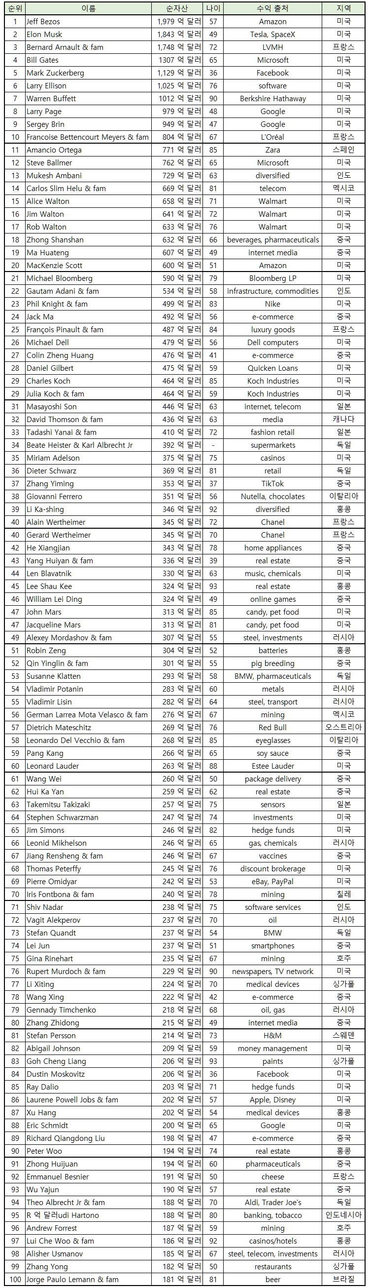 2021년 4월 기준 세계 억만장자 순위