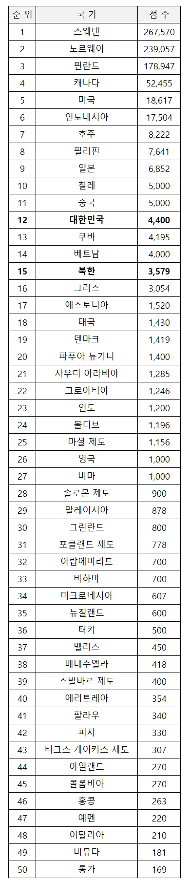 1위 스웨덴, 2위 노르웨이, 3위 핀란드, 4위 캐나다 5위 미국... 대한민국은 12위... 북한하고 합치면 일본보다 섬이 많아집니다