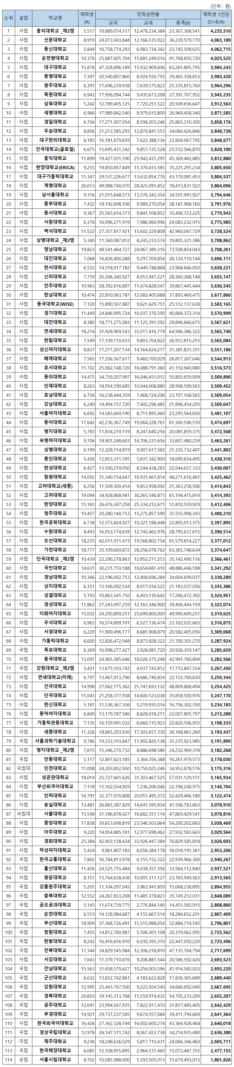 (1인당 장학금 순위)