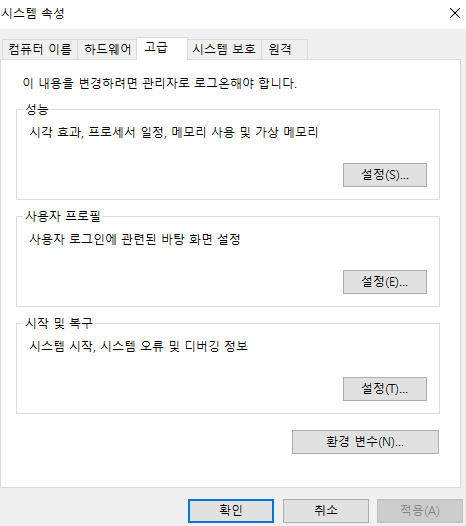 내PC >> 속성 >> 시스템보호(속성창 오른쪽) >> 환경변수