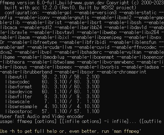 - ffmpeg를 치면 아래와 같이 출력되면 정상 설치.