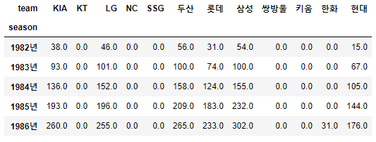 df = baseball.pivot_table(values='win', index = 'season',columns='team')
