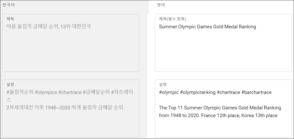 대단한 언어 능력자가 아니라면 유튜브에 모든 언어를 설정하기는 어렵습니다. 2번째 시청자 타겟 언어나, 영어만이라도 추가해 주면 좋습니다. 그러면 트래픽 증가와 구독자 모집에 도움이 된다고 생각됩니다.