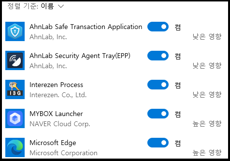 현재 컴퓨터 부팅시 실행되는 프로그램과 꺼져 있는 프로그램을 확인 할 수 있습니다. 불필요한 프로그램들 끔 변경 해주시면 됩니다.