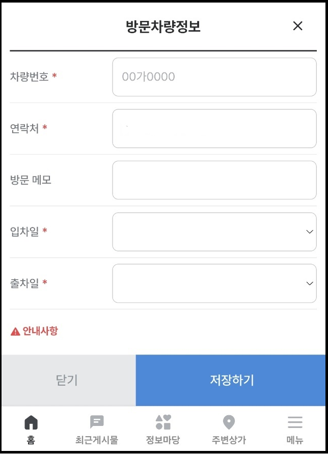 차량번호, 입차일, 출차일 등 필수 항목 입력후 저장 하시면 됩니다.